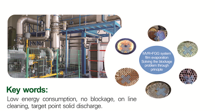 MVR+FXGG system is consisted of two units: MVR refer to recycling compression machine group of the secondary steam. Through recycling and utilization of the energy in the process, it almost will not use additional water vapor for heating, only able power energy is consumed (general 32degree/ton waste water),the energy consumption is very little.
